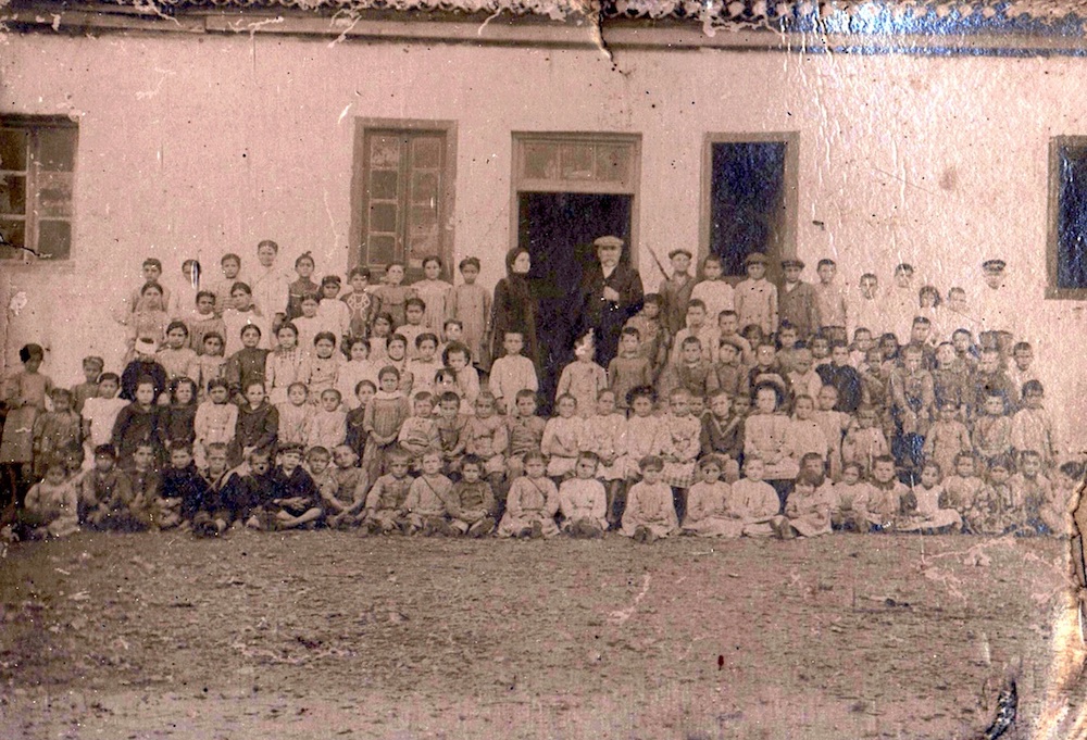 Η φωτογραφία απεικονίζει τον δάσκαλο του σχολείου με τους μαθητές στις αρχές του 20ου αιώνα.
