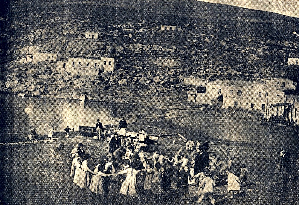 Χορός μαθητών και μαθητριών της Γρωμαννείου Σχολής. Η φωτογραφία έχει τραβηχτεί στις αρχές του 20ου αιώνα μπροστά από την είσοδο του σχολείου. Στο βάθος διακρίνεται το κτίριο που στέγαζε τα γραφεία διοίκησης των μεταλλείων, στα αριστερά η θάλασσα.