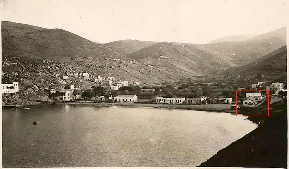 Πανοραμική άποψη της παραλίας του Μ.Λιβαδίου τραβηγμένη περίπου στα 1935. Το σχολείο φαίνεται στο δεξί άκρο. Η κεραμοσκεπή αντικαταστάθηκε το 1952 με πλάκα.